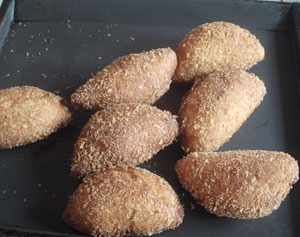 Making curry bread is a bit tricky since it's deep-fried. It's easy to make an oily, soggy lump if you fry it too long or at too low a temperature, but if you don't fry it long enough the center part where the dough meets the filling may be raw. My solution for this is to fry it until it's puffed and crisped, then to finish it in the oven. The other trick is to roll out the dough as thinly as you can manage without making it so thin that the curry is going to burst through.