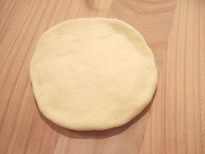 Start forming the buns. With a rolling pin or with your hands, flatten out each piece into a thin round, with the center thicker than the edges. If you're making 10 buns the circle should be about 18cm / 7 inches in diameter.