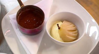 Poached pears with vanilla ice cream and a serious to-die-for chocolate sauce (a.k.a. Poires Belle Hélène) (Recipe)